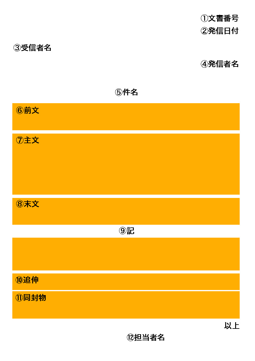 - ⑫担当者名…用件についての連絡先が、④発信者名と異なる場合に担当者名と連絡先を書きます。