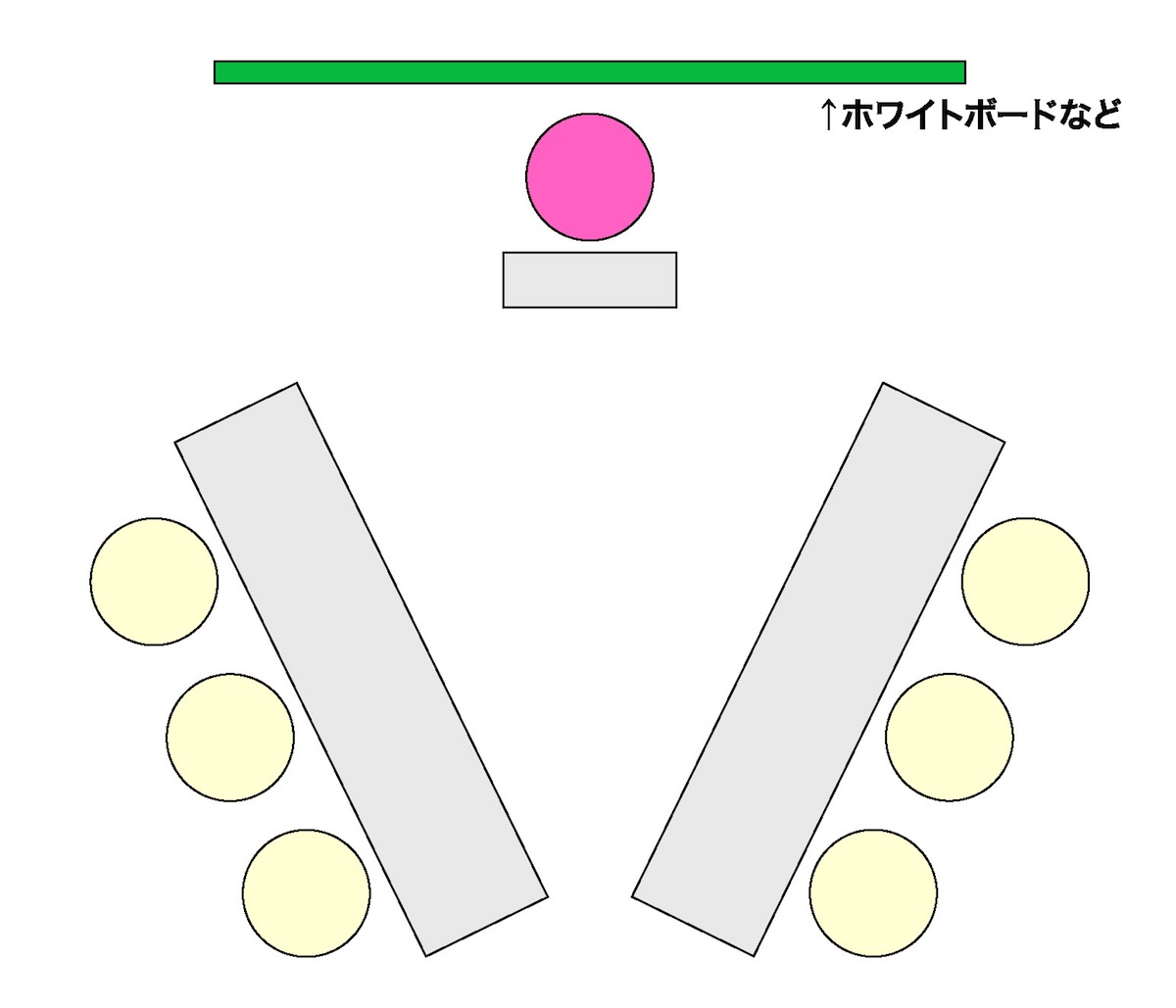 V字型のテーブル配置は、コの字型のテーブル配置よりも前方が見やすくなるので、ホワイトボードやスクリーンを利用する頻度が高いときに便利です。