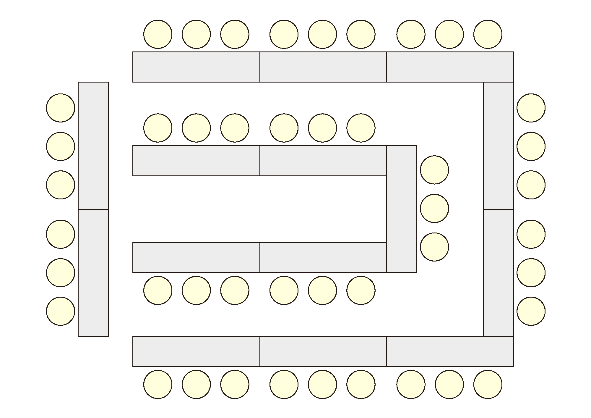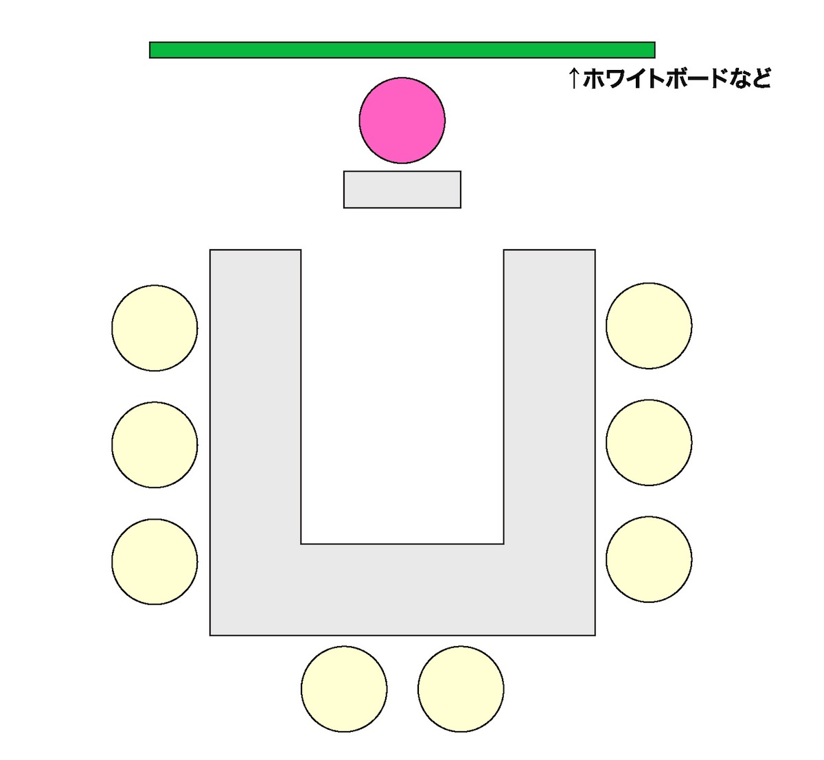 上の図でいうと、ロの字に配置したテーブルにコの字型に着席することになります。